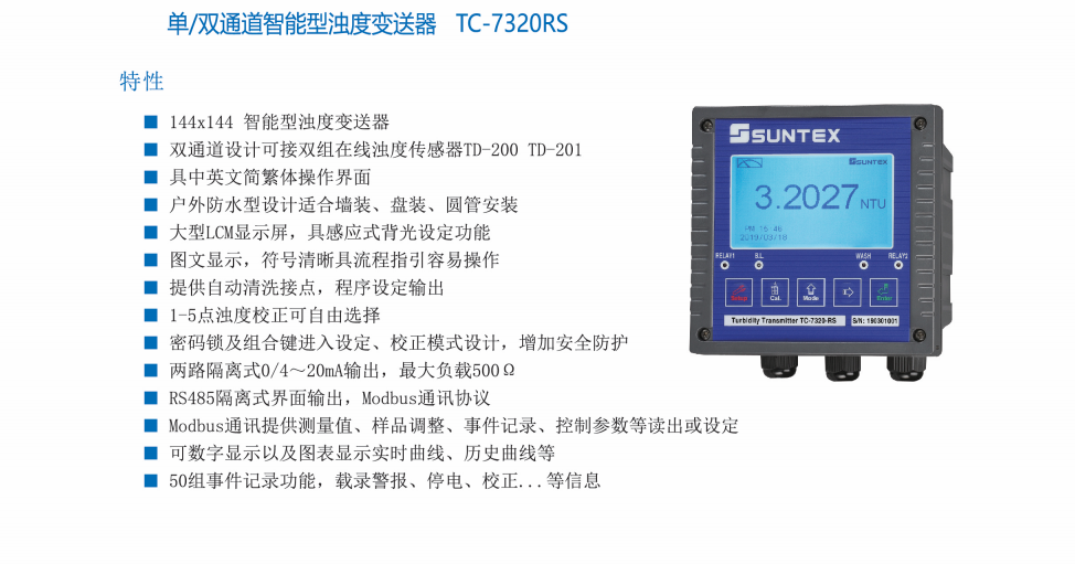 【SUNTEX上泰】在线低量程浊度变送器 单/双通道智能型浊度变送器 TC-7320RS